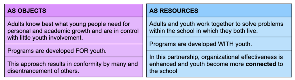 Providing opportunities for youth to become more engaged in their school has numerous benefits to the school and to young people. Students can identify conditions that need changing. They can advocate for themselves and their peer and contribute valuable information in problem-solving or decision-making processes.